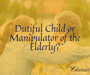 As parents age and their physical and mental capacities diminish, it is natural for their adult children, recognizing the parents’ decreasing ability to care for themselves, to step in and help them. Often, a specific child will take over the bulk of the responsibilities such as taking the parent to doctor’s appointments or the attorney’s office. As the parent begins to depend on the child more and more, it may make sense to appoint the child as a trusted decision maker and even to give them a larger inheritance to compensate them for their time. At the same time, other family members must take extreme care to ensure that the elderly parent is not being exploited by a manipulative caretaker.